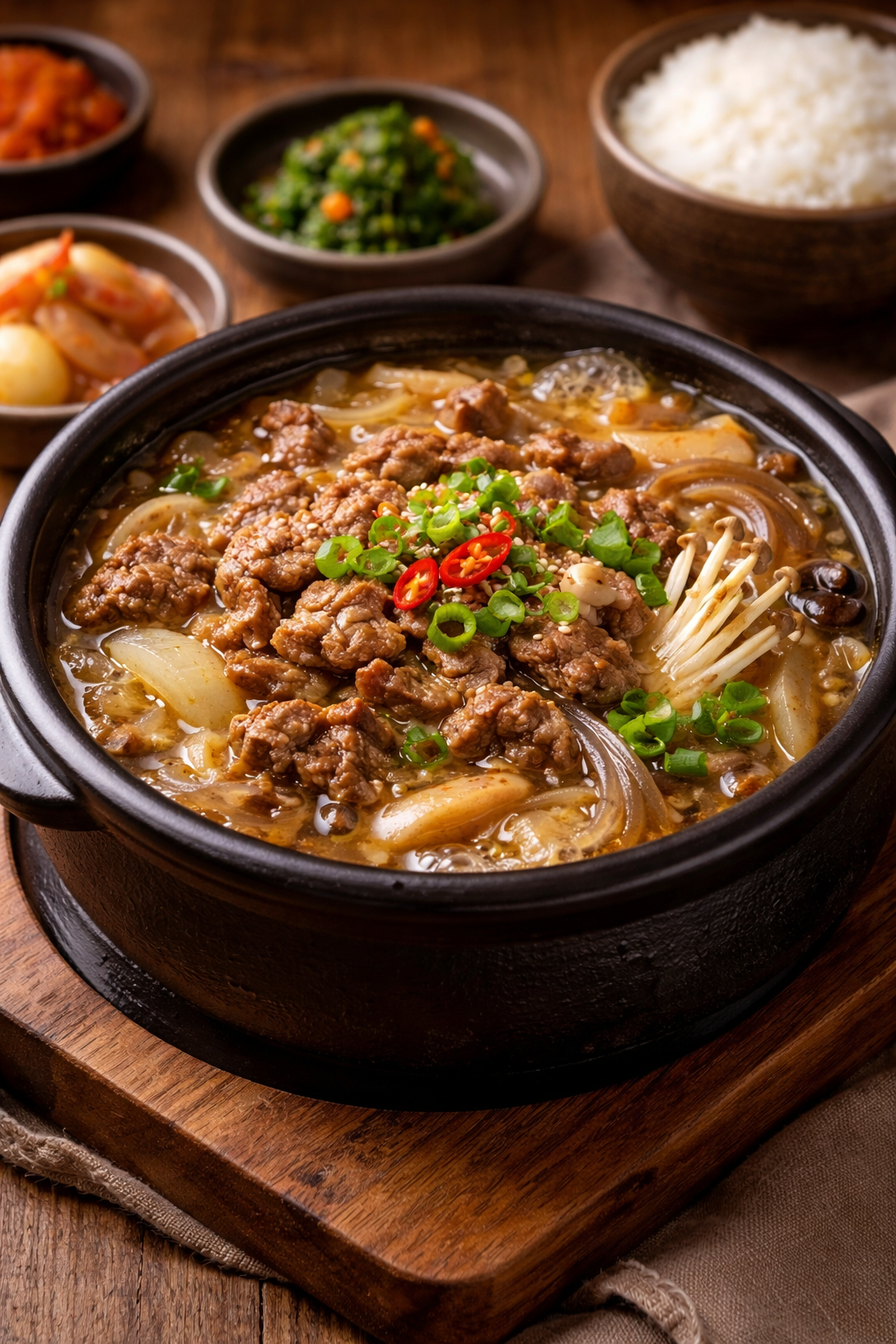 국물의 양과 농도는 뚝배기불고기의 정체성을 결정짓는 요소입니다. 지나친 단맛이나 물기가 과도해지면 '불고기' 특유의 구운 향이 희미해질 수 있습니다. 따라서 조청쌀엿의 양을 조절하고, 물의 양을 정확히 지키며, 중약불에서 서두르지 않고 천천히 조리하는 인내심이 필요합니다. 잘 조절된 국물과 적당히 익은 고기가 만났을 때의 따끈한 만족감은 추운 날씨에 한 끼로 충분히 기억에 남는 풍미를 선사합니다.